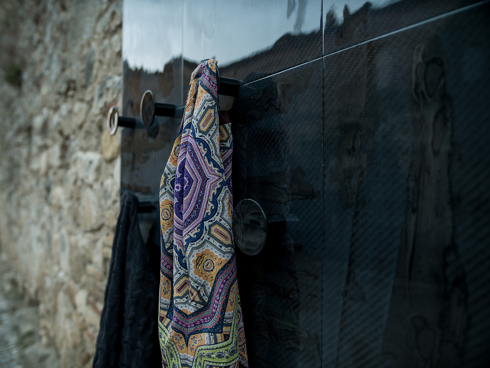 This elegant and unique coat rack is part of the Sorry Jannis collection. The panels are crafted from Frisoli Lachesi, an exclusive material developed by Frisoli that combines the deep grey of carbon fiber with light-blue fiberglass. The coat rack is then coated with specialized aerospace resins, creating a one-of-a-kind effect that sets each panel apart.